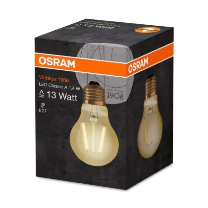 Cette ampoule Osram Vintage 1906 LED E27 Poire Filament Dorée 1.4W 120lm - 825 | Remplacement 15W avec son efficacité lumineuse de lumen par watt vous permettra de profiter d’un éclairage de qualité. Avec sa durée de vie de 15000 heures, vous n’aurez pas à vous soucier de son remplacement avant quelques années.